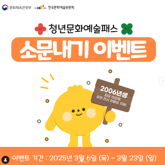 청년문화예술패스를 통해 보다 다양한 문화예술을 경험하고, 문화생활을 더욱 풍요롭게 즐기시길 바랍니다! 😊
