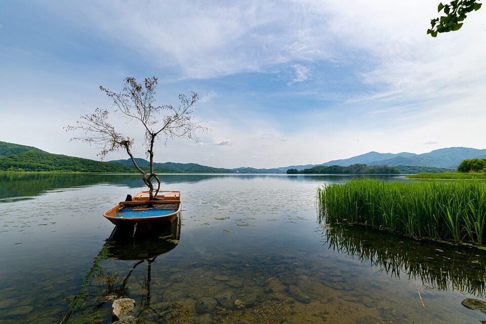 📸 포토존: 두물머리 나무 아래 벤치, 나룻배, 물가 데크
